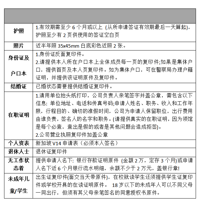 【新加坡旅游簽證費(fèi)用包括】以上報(bào)價(jià)已含新加坡領(lǐng)館收費(fèi)、我司服務(wù)費(fèi)以及英文翻譯。