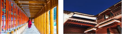 拉卜楞寺院的建筑粗獷大方,古樸典雅,穩(wěn)堅(jiān)耐用。大型佛殿頂部,均有銅質(zhì)鎏金法輪、陰陽獸、寶瓶、勝幢、雄獅等。整個(gè)建筑莊嚴(yán)巍峨、宏偉壯