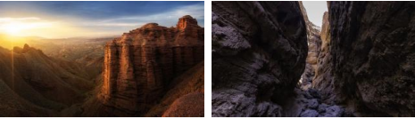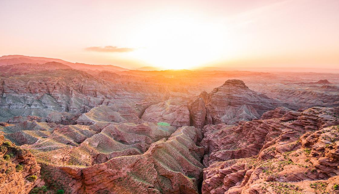 光的照耀下,各處造型奇特的山地丘陵色彩斑斕、氣勢磅礴。