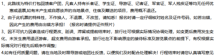 特殊說明:行程景點(diǎn)門票均為旅行社統(tǒng)一采購(gòu)價(jià),且經(jīng)旅游局批準(zhǔn)已進(jìn)行旅游團(tuán)隊(duì)系統(tǒng)的優(yōu)惠,故對(duì)所有證件(學(xué)生證、教師證、軍官證、老年證、殘疾證等證件)均不在享受任何優(yōu)惠政策,其優(yōu)惠價(jià)格不予退還。贈(zèng)送項(xiàng)目及景點(diǎn)如因個(gè)人原因或不可抗力因素或天氣原因無法參觀游覽,門票費(fèi)用不退,不置換,敬請(qǐng)諒解!