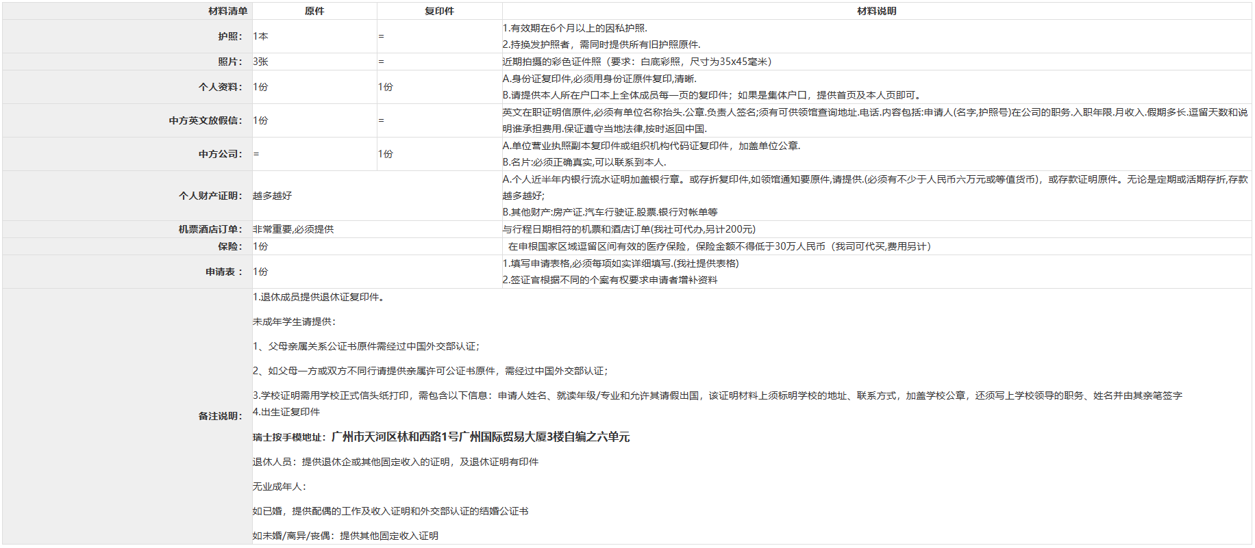 瑞士旅游簽證所需材料