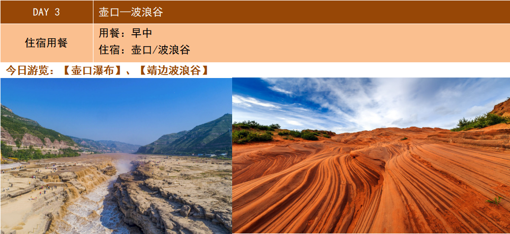 早餐后赴【壺口瀑布】(游覽時間約1.5H,電瓶車40/人自理)世界級的地質奇觀十里龍槽,柯受良、朱朝輝飛黃標志,孟門山等,欣賞晉陜峽谷奇特風光,感受黃河母親的神秘氣息!近觀氣勢磅礴的黃河風采,感受“天下黃河一壺收”。之后前往靖邊參觀游覽時間的紋路、上帝的指紋中國【靖邊波浪谷】(玻璃橋50元自理)(游覽時間約2-3H)近距離的感受丹霞地貌的魅力,由于地殼上升、巖石被流水切割侵蝕、山坡崩塌后才有了今天這鬼斧神工的美景,再次自由參觀拍照后,波浪谷展示的是由數(shù)百萬年的風、水和時間雕琢砂巖而成的奇妙世界。波浪谷巖石的復雜層面,是由一億五千萬前侏羅紀就開始沉積的巨大沙丘組成。沙丘不斷地被一層層浸漬了地下水的紅沙所覆蓋,天長日久,水中的礦物質把沙凝結成了砂巖,形成了層疊狀的結構。后前往波浪谷安排酒店入住休息。