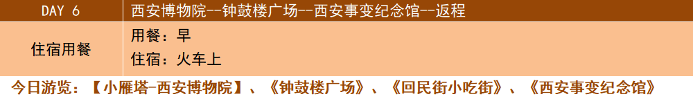 早餐后,游覽【小雁塔-西安博物院】(參觀約2小時),(每周二閉館一天)西安博物院在國內博物館(院)中獨樹一幟,以千年古塔園林式遺跡休閑景區(qū)以及古都西安現(xiàn)代型歷史博物館而聞名。小雁塔即“薦福寺塔”,位于西安城南薦福寺內,與大雁塔相距三公里。因低于大雁塔,故稱“小雁塔”,小雁塔在漫長的歲月里,經受了1200多年風雨的侵襲和70余次地震的考驗依然屹立不倒,令人嘆服古代能工巧匠高超的建筑技藝,近距離的觸摸這千年古剎。中餐后參觀我國目前規(guī)模最大,建筑最宏偉,保存最完整的明代建筑之一【鐘鼓樓廣場】(約1小時)細細品味古長安八景之一“晨鐘暮鼓”的古老和悠遠;然后赴與鐘鼓樓近在咫尺的回民小吃一條街,品嘗特色小吃,后前往前往位于西安市建國路60號的西安事變紀念館(游覽約1小時),由三座磚木結構的西式樓房構成主體建筑,是震驚中外的西安事變發(fā)生地。后根據(jù)火車時間送往西安站,結束愉快的旅程!