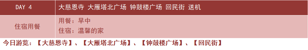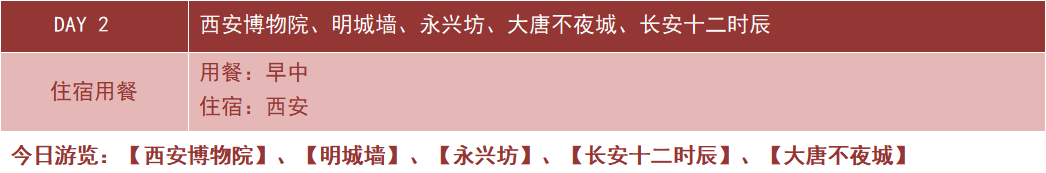早餐后前往【西安博物院】(周二閉館),西安博物院是西安市的一座集博物館、名勝古跡、城市園林為一體的博物館。以展示的珍貴文物,唐代千年古塔、悠揚的雁塔晨鐘、秀麗的園林景觀而聞名。以西安博物院的中心建筑小雁塔為設計元素,小雁塔是西安博物院收藏的最大文物。館藏陳列以“古都西安”的為總標題,又分為“千年古都”和“帝都萬象”兩部分。中餐品嘗熱騰騰的,傳遞祥和與溫暖的《餃子餐》中餐后參觀世界上規模最大保存最完整的軍事堡—【明城墻】(約1小時),這座雄偉的西安古城墻是明代初年在唐長安城的皇城基礎上建筑起來的,也是西安這座歷史文化名城的重要標志之一,其規模之大,保存之完整為世界少有,在此可領略古色古香的古城風光。游覽非物質文化美食街【永興坊】,這里沒有重復的店面,沒有加盟店,都是西安本土出名的老店或開的分店咸陽過來開的面館,潼關過來做的肉夾饃,陜北橫山燉的羊肉……永興坊地地道道舌尖上的美食,一口吃遍陜西,讓我們一起搭乘吃貨號小火車,在永興坊里開心的“逛吃,逛吃,逛吃……”隨后身著唐裝,讓每一個人重新體驗到一種流動的東方文化精髓。后前往新晉網紅打卡地【長安十二時辰】(參觀約1.5小時左右)長安十二時辰主題街區是以唐市井文化為源點,以網劇《長安十二時辰》IP為主題,以沉浸式體驗為核心,在建筑、軟裝、錢幣、人物、服裝、語言、音樂、故事等領域進行全唐化包裝,同時圍繞深度沉浸式故事體驗,設置配套的餐飲、文創、演藝等業態內容,整體打造集全唐空間游玩、唐風市井體驗、主題沉浸互動、唐樂歌舞演藝、文化社交休閑等為一體的全唐市井文化體驗地。游覽【大唐不夜城】(約1小時)是中國十大高品位文化步行街、西安年·最中國主會場。一個耗資50億打造的新唐人街,整條街由大唐群英譜、貞觀之治、武后行從、霓裳羽衣、雁塔題名、開元盛世等13組大型文化群雕貫穿其中。還有專門為這條街量身打造的璀璨絢爛的景觀燈,結合周圍恢弘大氣的精致仿唐建筑群,以及每隔50米一組不同風格各色駐場樂隊!沉浸其中,拍照不停,興奮不能自拔,宛如夢回盛唐!現已成為來西安旅游必要多次前往的網紅文化街區,在這里還可以偶遇網紅不倒翁小姐姐,與其牽手,一起夢回大唐!用餐后入住酒店休息!!