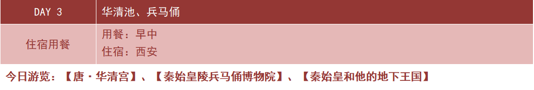 早餐后,乘車約1小時赴臨潼,參觀最完整的中國唐文化標志性景區【唐·華清宮】(約1.5小時 自理:華清宮電瓶車往返20元/人或驪山往返索道60元/人),這里因驪山亙古不變的溫泉資源、烽火戲諸侯的歷史典故、唐明皇與楊貴妃的愛情故事及西安事變的發生地而享譽海外。華清宮本是一個普通的皇家避寒宮殿,華清池因楊貴妃而享譽古今。一千多年前三郎與玉環的愛情,在飛霜殿內、在九龍湖上、在石榴樹下、在貴妃池旁,恩愛十年抵不上馬嵬士兵嘩變,是愛?是恨?美人已去,池仍在,慕名而來只為一睹貴妃出浴的香艷之地。中餐品嘗當地特色美食,后讓我們共同期待3D巨幕電影【秦始皇和他的地下王國】或者VR沉浸式穿越時光隧道,走進大秦墓室的【大秦印象VR體驗中心】(贈送項目無退費)。后參觀“世界第八大奇跡”、肅立于地下兩千年之久的【秦始皇帝陵博物院】(約 2.5 小時 自理:兵馬俑電瓶車單程 5+15 元/人),(1、2、3 號坑、銅車馬展廳),這是世界上最大的“地下軍事博物館”世界考古史上最偉大的發現之一,龐大的地下博物館埋藏著中國第一位皇帝秦始皇陵寢的守護軍隊,近萬人與真人真馬同樣大小的陶俑組成了龐大的軍隊,這些兵俑職責分明,軍陣整齊,將軍、武士、弓箭手、車士、騎兵應有盡有,不知不覺間便將你引入了戰馬嘶鳴,崖戰在即的秦軍戰營,使游人無不為之震懾。晚餐后入住酒店休息。